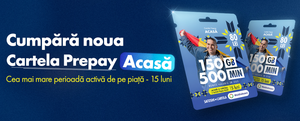 Acum poți achita în avans 6 luni de servicii Prepay pentru Cartela 40 sau Cartela 80 Acasă, în format SIM sau eSIM. În schimb, Moldtelecom îți oferă un voucher cadou de 500 de lei, valabil în Moldtelecom eShop, pe care îl poți folosi ca reducere pentru gadgetul dorit: telefon, căști, tabletă sau alte dispozitive moderne — pentru tine sau pentru cineva drag.