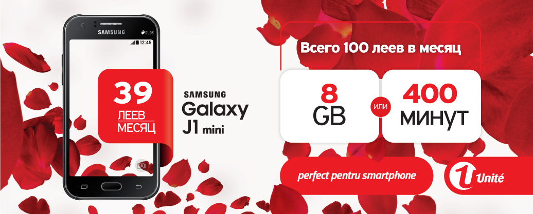 При подключении к любому абонементу Unite ты получаешь современный смартфон по лучшей цене в рассрочку. Запечатли самые красивые моменты вместе со своими близкими с новым Samsung Galaxy J1 mini, с идеальной камерой для сэлфи – всего за 39 леев в месяц.