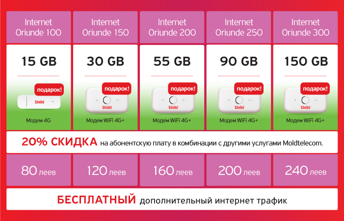Этим летом абонементы Internet ORIUNDE от Unite стали более выгодными и предоставляют больше включенного интернета. Это потому, что слишком много интернета не бывает, особенно летом, когда тебя ждут каникулы и приключения. О чем ты мечтаешь? Что хотел бы реализовать этим летом? Каждый день ты можешь совершать новое открытие. Выбирай абонементы Internet ORIUNDE от Unite, и всего за 120 леев в месяц ты получишь 30 GB и модем 4G с wifi в подарок при подключении, чтобы интернет был у тебя всегда, куда бы ты не отправился. Каждый день приносит тебе новые возможности для воплощения целей и мечтаний. Будь то развлечения или профессиональные достижения, мобильный интернет всегда жизненно необходим на твоем пути к успеху. Открывай новые интересные места, новые развлечения, новые рецепты, видео-уроки, семинары, игры или сам заливай фотографии, видео и файлы больших разменов и свободно пользуйся онлайн Вселенной. Теперь тебе не нужно беспокоиться о трафике данных. Выбери любой из абонементов Internet ORIUNDE от Unite, который подходит твоему стилю жизни, и получи больше всего включенного мобильного интернета на рынке. Ты можешь получить от 15 GB за 80 леев в месяц до 150 GB за 240 леев. Кроме того, ты получаешь модем 4G с wifi в подарок при подключении, чтобы подключать к интернету все гаджеты, нажав лишь одну кнопку, где бы в стране ты не находился. А если ты используешь весь включенный трафик данных, не стоит беспокоиться, потому что ты можешь бесплатно и неограниченно пользоваться интернетом на более низкой скорости. По истечению периода действия специального предложения на 6 месяцев, ты начнешь получать бонусы по программе лояльности, с помощью которой твой абонемент станет еще более выгодным. Заходи на moldtelecom.md, выбери подходящий абонемент, заполни онлайн-форму и отправь заявку. А мы привезем тебе контракт, карточку и модем прямо домой. Unite. Сеть больших возможностей. Часть семьи Moldtelecom. Оператор номер 1 интегрированных услуг.