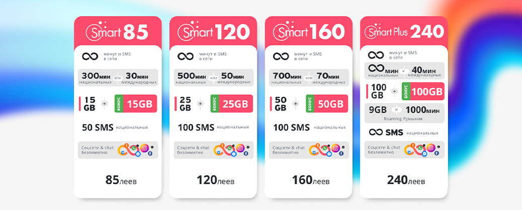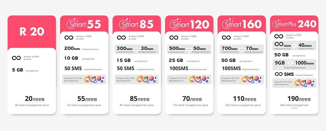 безлимитную скидку в размере 50 леев ежемесячно при подключении абонемента мобильной связи, начиная с Smart 120 или выбирая льготный абонемент: R20, Smart 55 или Smart 85.