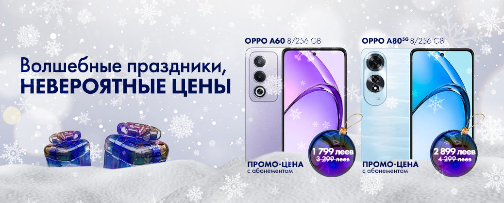 выбери между OPPO A60 8/256 GB всего за 1799 леев или OPPO A80 5G 8/256 GB по цене всего за 2899 леев.