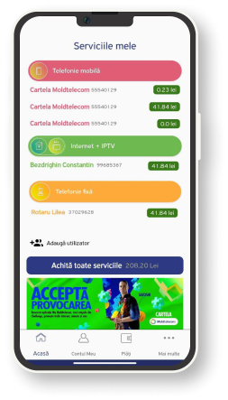 Cu aplicația My Moldtelecom deții controlul deplin să gestionezi conturile și serviciile tale și ale membrilor de familie, oricând și oriunde.