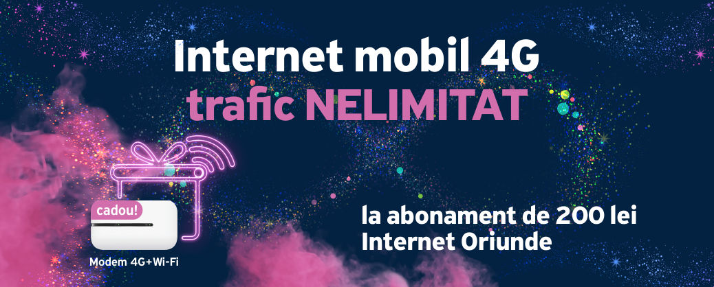 Internet Mobil, optează pentru unul cu trafic nelimitat, la doar 200 lei lunar și modem 4G cu wi-fi cadou la conectare. Imaginează-ți, ce poți face fără limite și savurează magia sărbătorilor din plin.