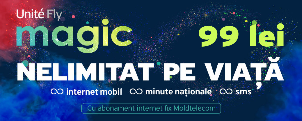 Fly Magic, nelimitat pe bune. La doar 99 lei, ai trafic internet mobil nelimitat, SMS-uri și minute naționale nelimitate, minute în rețeaua Unite și Moldtelecom, nelimitat.
