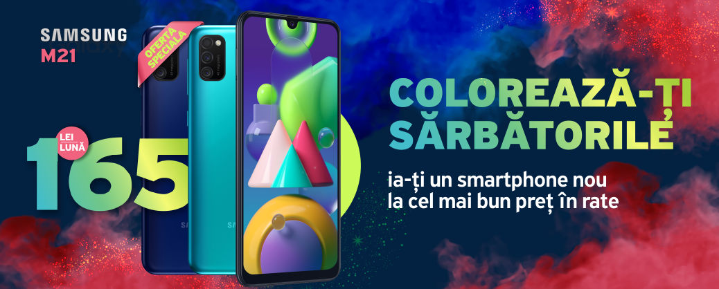 Samsung Galaxy M21 cu 3 camere foto și ecran super AMOLED, oferit la preț special în rate, la doar 165 lei lunar.