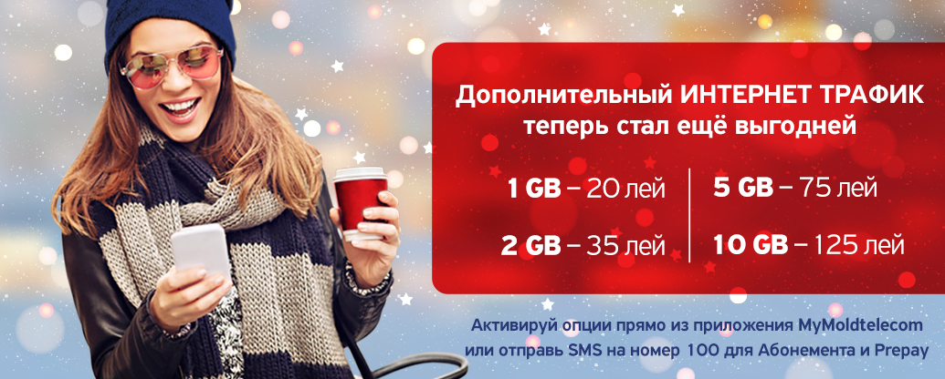 Если в твоем абонементе есть ограничение на трафик данных или если у тебя пакет Prepay, ты в любое время можешь рассчитывать на дополнительную опцию в 1 GB всего лишь за 20 леев или на 2 GB всего за 35 леев, действительные в течение 30 дней.
