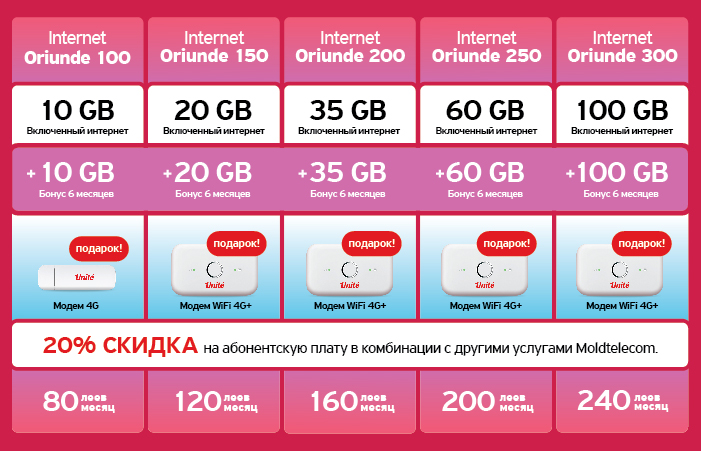 Кроме того, больше никаких перерывов связи. Зайди на unite.md, укажи подходящий тебе абонемент Internet Oriunde и отправь заявку онлайн, а мы доставим контракт, карточку и модем прямо тебе домой.