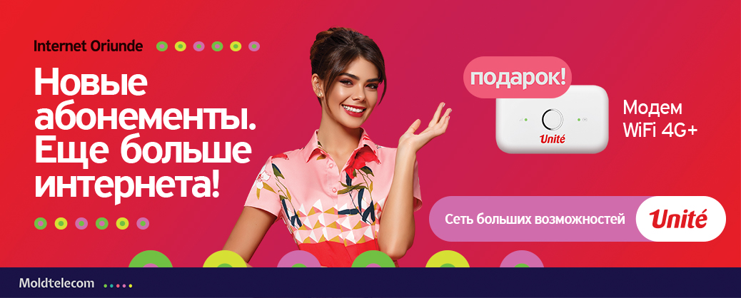 Этим летом абонементы Internet ORIUNDE от Unite стали более выгодными и предоставляют больше включенного интернета. Это потому, что слишком много интернета не бывает, особенно летом, когда тебя ждут каникулы и приключения. О чем ты мечтаешь? Что хотел бы реализовать этим летом? Каждый день ты можешь совершать новое открытие. Выбирай абонементы Internet ORIUNDE от Unite, и всего за 120 леев в месяц ты получишь 30 GB и модем 4G с wifi в подарок при подключении, чтобы интернет был у тебя всегда, куда бы ты не отправился. Каждый день приносит тебе новые возможности для воплощения целей и мечтаний. Будь то развлечения или профессиональные достижения, мобильный интернет всегда жизненно необходим на твоем пути к успеху. Открывай новые интересные места, новые развлечения, новые рецепты, видео-уроки, семинары, игры или сам заливай фотографии, видео и файлы больших разменов и свободно пользуйся онлайн Вселенной. Теперь тебе не нужно беспокоиться о трафике данных. Выбери любой из абонементов Internet ORIUNDE от Unite, который подходит твоему стилю жизни, и получи больше всего включенного мобильного интернета на рынке. Ты можешь получить от 15 GB за 80 леев в месяц до 150 GB за 240 леев. Кроме того, ты получаешь модем 4G с wifi в подарок при подключении, чтобы подключать к интернету все гаджеты, нажав лишь одну кнопку, где бы в стране ты не находился. А если ты используешь весь включенный трафик данных, не стоит беспокоиться, потому что ты можешь бесплатно и неограниченно пользоваться интернетом на более низкой скорости. По истечению периода действия специального предложения на 6 месяцев, ты начнешь получать бонусы по программе лояльности, с помощью которой твой абонемент станет еще более выгодным. Заходи на moldtelecom.md, выбери подходящий абонемент, заполни онлайн-форму и отправь заявку. А мы привезем тебе контракт, карточку и модем прямо домой. Unite. Сеть больших возможностей. Часть семьи Moldtelecom. Оператор номер 1 интегрированных услуг.