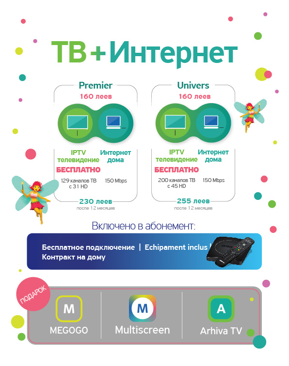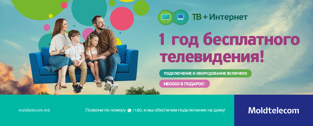 Телевидение – это волшебство. Наслаждайся самым большим числом телеканалов в HD качестве, бесплатным подключением и оборудованием, а также онлайн фильмотекой MEGOGO в подарок! Потому что сейчас ты получаешь 1 год бесплатного пользования цифровым телевидением при подключении или продлении контракта на услугу Интернет от Moldtelecom.