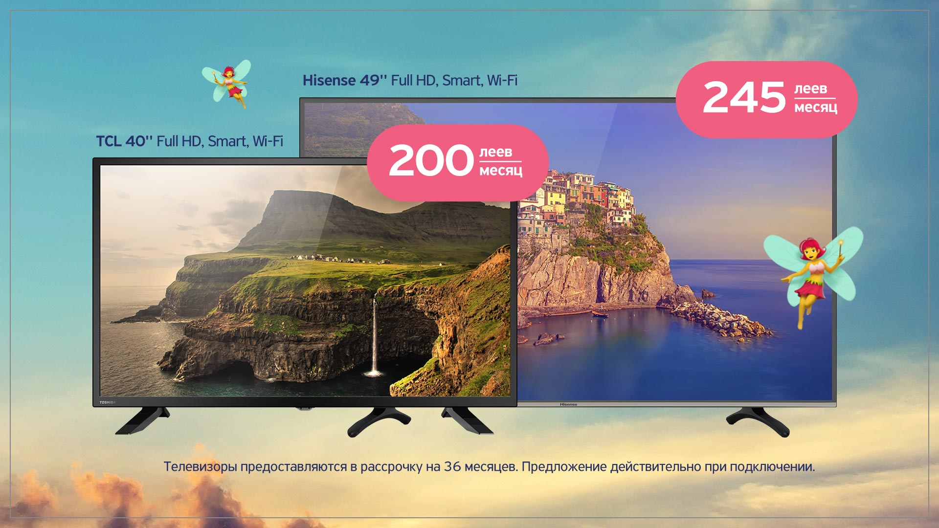 А так как ты заслуживаешь того, чтобы сполна получать удовольствие от возможностей цифрового телевидения Moldtelecom, при подключении ты получишь суперпредложение о покупке в рассрочку современных телевизоров. Например, ты можешь купить телевизор LTC 40”, Full DH, Smart, WI-FI всего за 200 леев в месяц или модель Hisense 49”, Full HD, Smart, WI-FI всего за 245 леев в месяц.