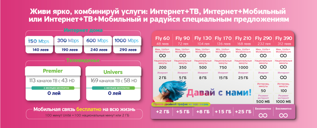 Подключи услуги фиксированного интернета от Moldtelecom всего за 140 леев в месяц и радуйся скоростью загрузки и скачиванием до 150 Мбит/с. Кроме того, ты получишь 6 месяцев бесплатного цифрового телевидения с 169 телеканалами, из которых 58 в формате HD для развлечения или романтических вечеров с близкими. Более того, получи в подарок бесплатно, на всю жизнь мобильный абонемент со 100 минутами в сети и 100 национальными минутами или 2 ГБ.