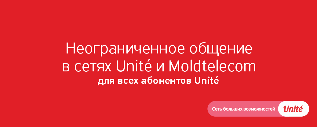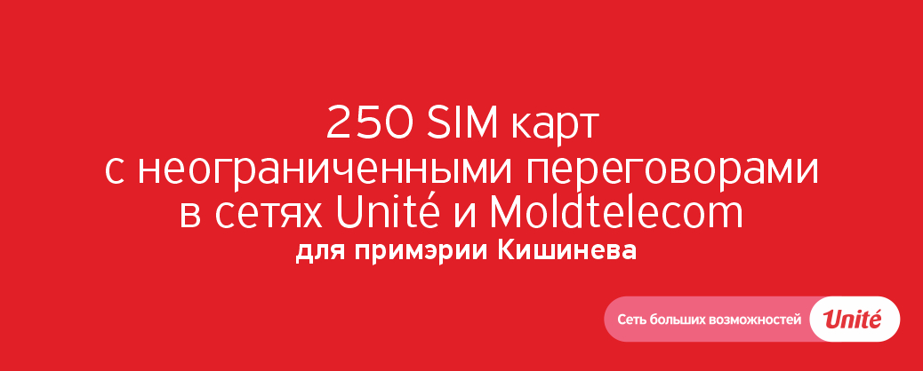 В эти тяжелые для всего общества дни, общение с близкими помогает нам легче переносить изоляцию и пережить трудные времена. Мы понимаем, насколько важно сохранять эмоциональную связь с дорогими людьми, и поэтому предоставляем всем абонентам мобильной связи Unite, физическим и юридическим лицам, неограниченные переговоры в сетях Unite и Moldtelecom, для обладателей карточки Prepay и абонементов, на протяжении двух месяцев, до 31 мая текущего года.