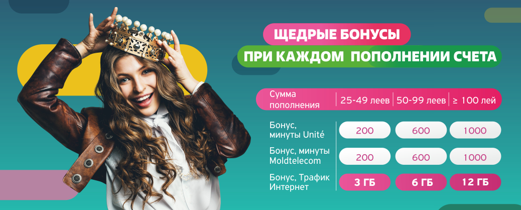 И это не все. С новой карточкой Prepay от Unite, получаете новую бонусную программу. За каждое пополнение счёта, вы получаете щедрые бонусы. И поскольку мы вместе отмечаем запуск новой карточки Prepay, до 30 сентября вы получаете больше ГБ бонуса при пополнении счета. Например, при пополнении счета на 50 леев вы получаете БОНУС - 6 ГБ мобильного интернет-трафика и 600 минут в сети.