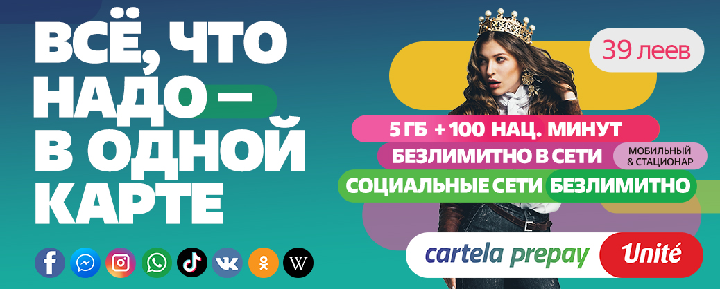 новую карточку Prepay, которая предлагает вам более щедрое содержание, созданное специально для максимального соответствия вашим привычкам общения. Больше интернет-трафика, больше национальных минут и неограниченный просмотр самых популярных социальных сетях всего за 39 леев. У вас есть все и даже немного больше в одной карточке, чтобы быть самым крутым среди друзей.