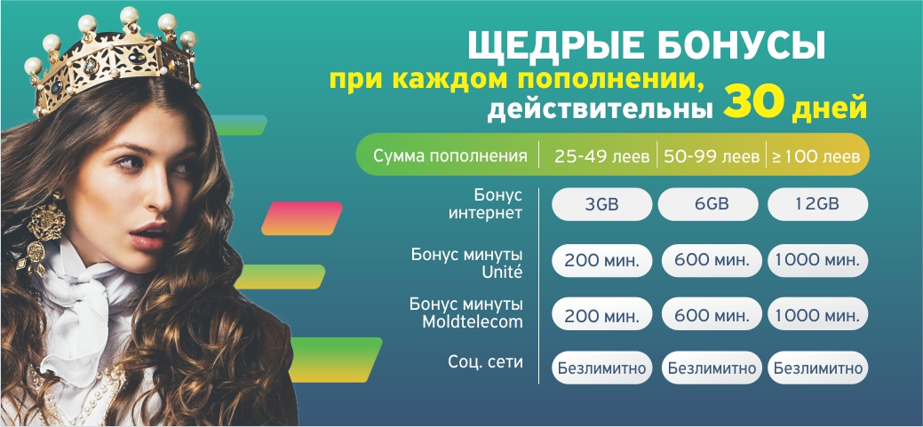 На этом сюрпризы не заканчиваются! С каждым пополнением счета на сумму более 25 леев ты получаешь супер-бонусы, такие как минуты в сети и интернет-трафик в течение 30 дней. Кроме того, у тебя есть безлимитный трафик для
