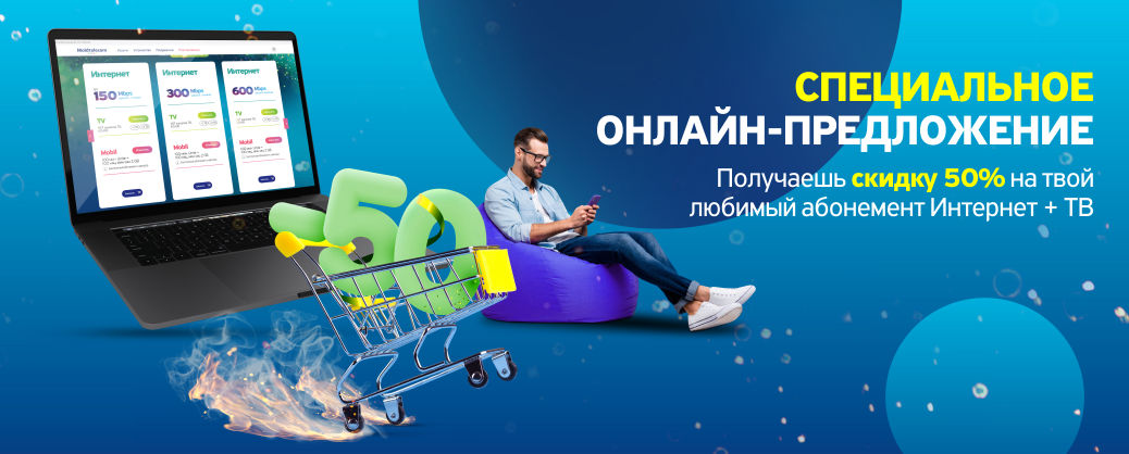 Подключившись на любой пакет с Интернетом и ТВ в марте, ты сможешь наслаждаться 50%-ой скидкой на абонемент в течении 6-ти месяцев.