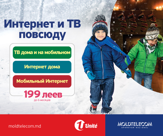 В праздники ты предпочитаешь проводить время с самыми родными и близкими, имея под рукой самые инновационные услуги – домашний Интернет и мобильный Интернет, домашнее и мобильное Телевидение в одном пакете, начиная от 199 леев в месяц, до 6 месяцев с момента подключения.