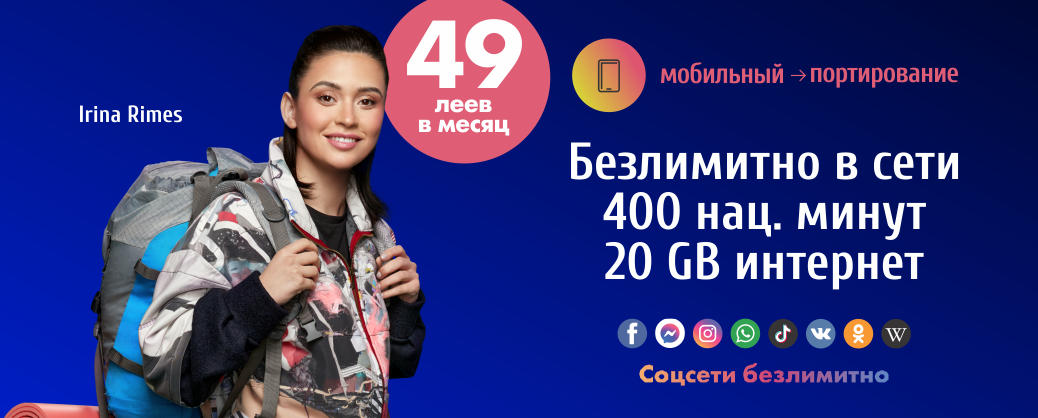 Всего за 49 леев в месяц у тебя есть: неограниченное количество минут и SMS в сети, соцсети и чат бесплатно, 20 ГБ, 400 национальных минут или 40 международных минут. А если ты хочешь действительно безлимитное предложение, с неограниченным количеством национальных минут и sms, безлимитным интернетом, ты можешь получить его всего за 99 лей в месяц.