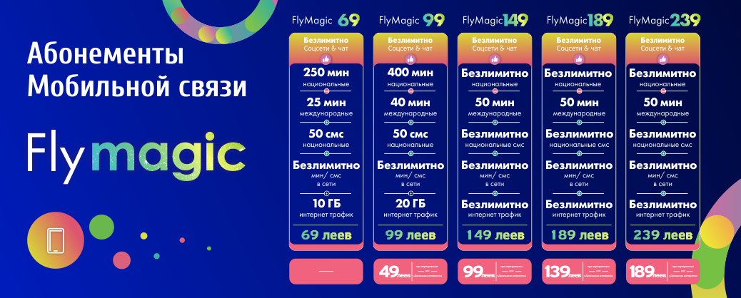 Fly Magic, которые включают неограниченные звонки в сети Moldtelecom, бесплатные соцсети, большой объем интернет-трафика и неограниченное количество национальных минут.