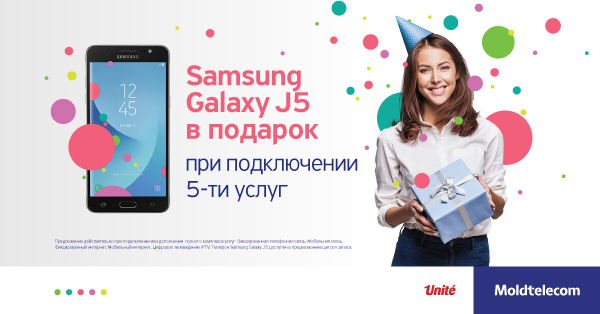 Создай подходящую для тебя комбинацию пакетов отвсех пяти услуг Moldtelecom прямо на сайте www.moldtelecom.md и оформи заказ на наши услуги онлайн, а подключение будет проведено у тебя дома.Быстро, доступно, функционально, а ты всегда на связи со всем миром как дома, так и с мобильного телефона. Все услуги в одном пакете, и - самое приятное - отличный подарок: Samsung Galaxy J5 за выбор услуг Moldtelecom.