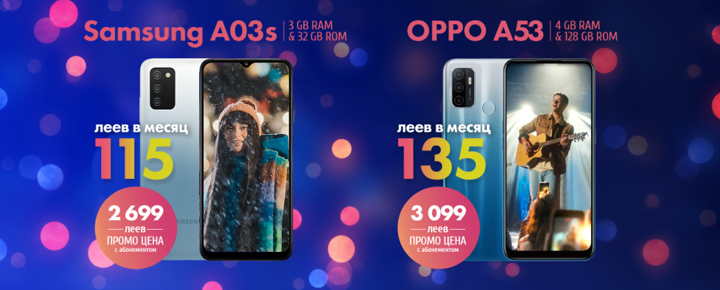 Și pentru ca, bucuria sărbătorilor de iarnă să fie deplină, îți oferim un preţ avantajos, în rate, la doar 115 lei lunar pentru telefonul Samsung A03S, cu focalizare automată, cameră macro şi senzor de adâncime pentru a surprinde cele mai importante momente din viața ta și a celor dragi. OPPO A53 îl ai cu 135 lei lunar, în rate, cu abonament de minim 60 lei și o perioadă contractuală de 24 luni.