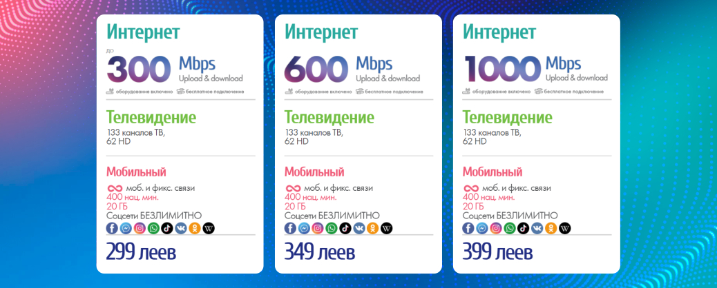 Также, у тебя есть возможность выбрать абонемент мобильной телефонии, начиная с 99 леев, с 400 национальных минут, 40 международных минут, 20 ГБ, безлимитными социальными сетями, минутами мобильной и фиксированной сети Moldtelecom и 50 национальных SMS-сообщениями.