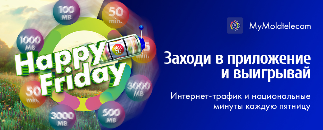 Заходи каждую пятницу в приложение MyMoldtelecom с 07.02.2022 по 08.03.2022 и испытай свою удачу. Будут разыграны выигрышные карточки с интернет трафиком в размере 100 MB, 500 MB, 1000 MB и 3000 MB, а также 25 или 50 национальных минут. Призы будут активированы сразу после стирания защитного слоя и будут действительны в течение 7 дней.