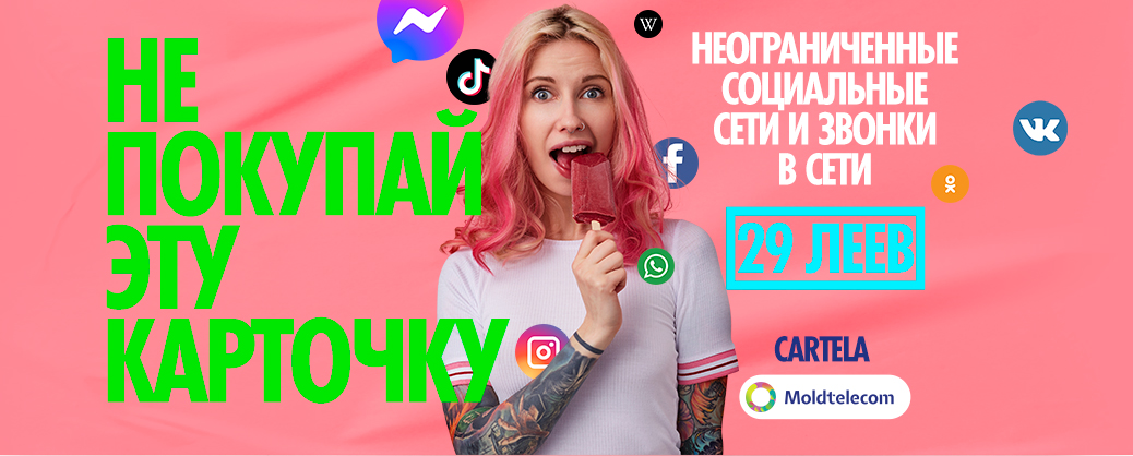 WOW, WOW, WOW! Будь в тренде и в курсе самых горячих предложений момента. Для более ярких эмоций и для общения без ограничений приобрети Cartela Moldtelecom и, всего за 29 леев, у тебя есть бесплатный интернет-трафик для социальных сетей и безлимитные звонки в сети Moldtelecom.