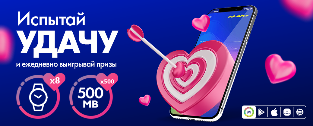 В период с 06.02.2023 по 05.03.2023 целься в удачу в приложении My Moldtelecom и удивите свою вторую половинку элегантными смарт-часами! Выигрывай 500 MB каждый день или получи больше шансов принять участие в еженедельном розыгрыше, где один победитель получит два умных часа – стильный и удобный.