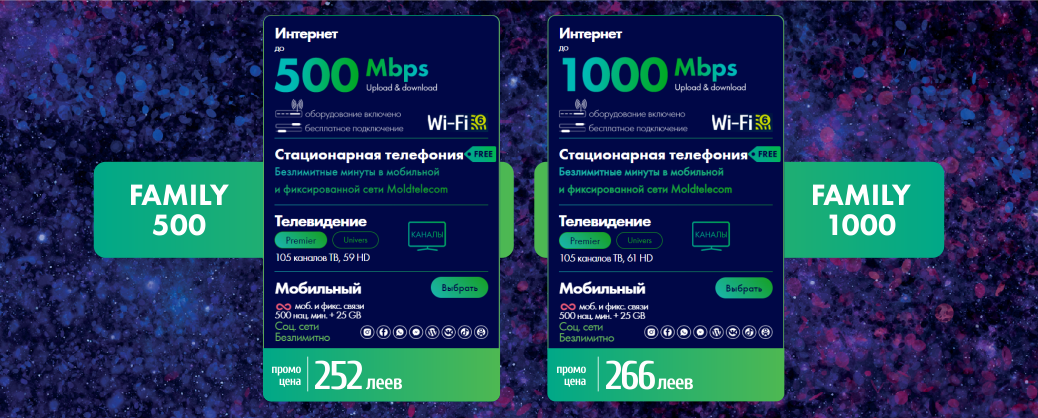 всего за 252 лея в месяц, ты получаешь домашний интернет со скоростью до 500 Мбит/с, а также бесплатное оборудование последнего поколения Wi-Fi 6. Более того, у тебя будет доступ к 105 телеканалам, из которых 61 в формате HD, для твоих незабываемых вечеров в кругу семьи! Также ты сможешь безлимитно разговаривать в сети Moldtelecom, получив 500 национальных минут и 100 национальных SMS, 25 GB интернет-трафика и неограниченный доступ к социальным сетям, чтобы всегда оставаться на связи с друзьями и коллегами.