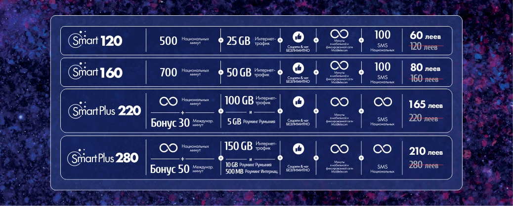 Таким образом, всего за 60 леев в месяц ты можешь безлимитно разговаривать в сети Moldtelecom, получив 500 национальных минут и 100 национальных SMS, 25 GB интернет-трафика и неограниченный доступ к социальным сетям, чтобы всегда оставаться на связи с друзьями и коллегами. В то же время, если темп твоей жизни предполагает частые поездки, особенно в Румынию, мы подготовили два выгодных абонементов - Smart Plus 220 и Smart Plus 280, которые включают интернет-трафик и минуты в роуминг. Также находясь за границей есть возможность звонить родственникам, друзьям или деловым партнерам превращая национальные минуты в международные. Таким образом, 10 национальных минут эквивалентны 1 национальной минуте.