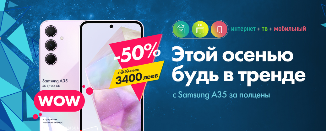 Купи новый Samsung A35 по специальной цене 3400 леев. Мы предлагаем скидку до 50%, в зависимости от количества заключенных услуг. Получи