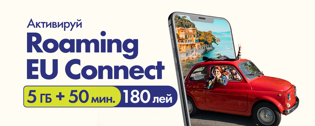 Если собираешься в поездку по странам Евросоюза, подключи опцию Roaming UE Connect — она даёт тебе 5 ГБ интернета и 50 минут для звонков внутри страны пребывания или в Молдову. Всего за 180 леев, срок действия — 30 дней. Это выгодное предложение — именно то, что нужно для спокойной поездки за границу или насыщенного эмоциями отпуска.