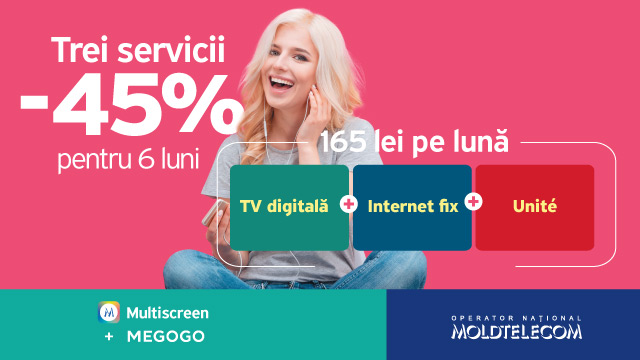 În cadrul acestui pachet, te bucuri suplimentar de serviciile Multiscreen şi Megogo. Serviciul Megogo îţi pune la dispoziție o video bibliotecă care conține o mulțime de filme, seriale și desene animate, disponibile pentru vizionare fără pauze de publicitate. Serviciul Multiscreen îţi permit să vizionezi filmele şi emisiunile tv preferate oricând îţi dorești direct de pe smartphone-ul, tableta şi laptopul tău. Mai mult, ai programe de loialitate, apeluri nelimitate în reţeaua Unite şi Moldelecom, precum şi condiţii speciale de procurare a dispozitivelor mobile cu pachetele de telefonie mobilă Unite.
