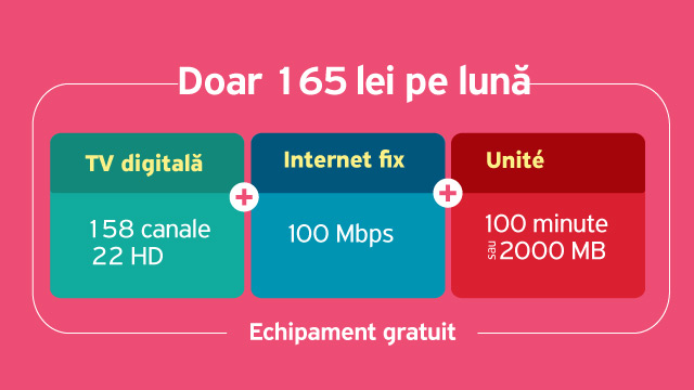 Ai comunicare cât încape în reţeaua cu cel mai stabil Internet fix, televiziune digitată cu tehnologia viitorului şi cu cele mai generoase oferte în telefonie mobilă. Bucură-te de o mulțime de avantaje oferite de combinarea a trei servicii într-un singur pachet.